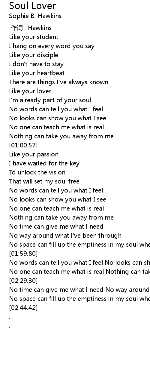 | [01:52.27] | No space can fill up the emptiness in my soul when I want you |