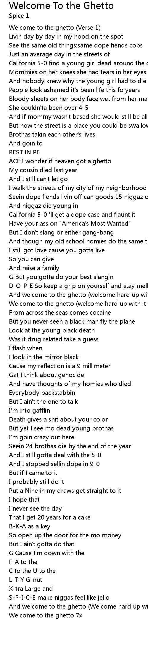 And welcome to the ghetto (Welcome hard up with it to my life) (chorus) 4x