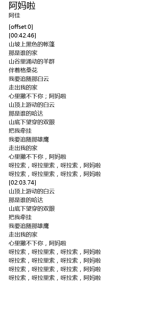 | [03:41.98] | 呀拉索,呀拉里索,呀拉索,阿妈啦 |