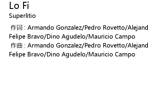 | [00:00.000] | zuo qu : Armando Gonzalez Pedro Rovetto Alejandro Lozano Andres Felipe Bravo Dino Agudelo Mauricio Campo |