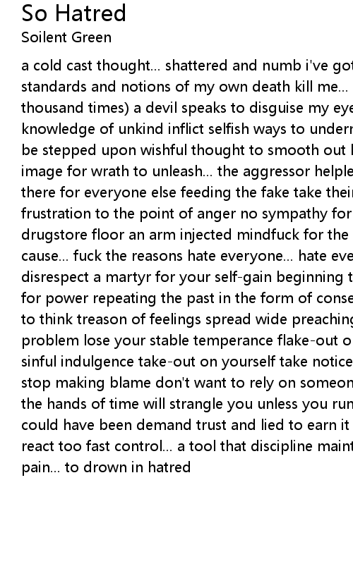 a cold cast thought... shattered and numb i've got this system in my head standards and notions of my own death kill me... i've already killed myself (a thousand times) a devil speaks to disguise my eyes so you cannot see the knowledge of unkind inflict selfish ways to undermind trust stepped on only to be stepped upon wishful thought to smooth out high tempers in need a doll an image for wrath to unleash... the aggressor helpless... help yourself stop being there for everyone else feeding the fake take their medicine to feel good frustration to the point of anger no sympathy for your way lying on the drugstore floor an arm injected mindfuck for the weak and impossible damn the cause... fuck the reasons hate everyone... hate everything hate yourself for disrespect a martyr for your self-gain beginning to numb myself murdering morals for power repeating the past in the form of consequences instagate a broken will to think treason of feelings spread wide preaching problems... you're the problem lose your stable temperance flake-out on situations another taste of sinful indulgence take-out on yourself take notice... no sense of accomplishment stop making blame don't want to rely on someone else stop pointing ones to shame the hands of time will strangle you unless you run left behind to cry about what could have been demand trust and lied to earn it grasp your actions before they react too fast control... a tool that discipline maintains swim oceans of pain... to drown in hatred |