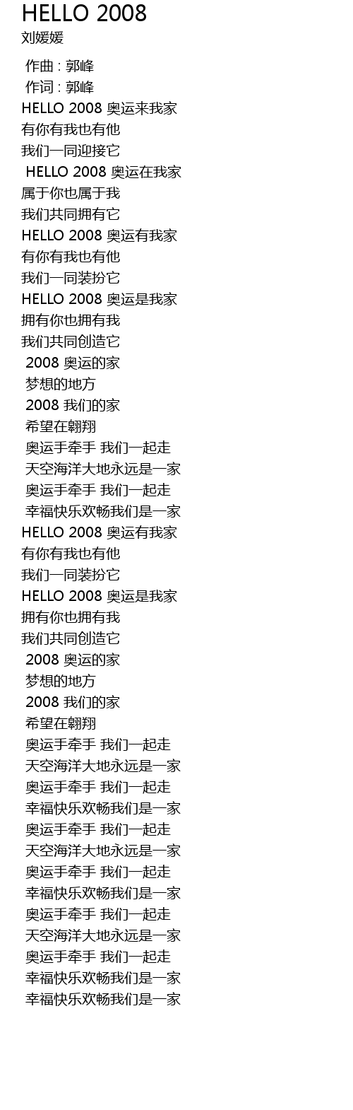 | [00:15.49] | HELLO 2008 奥运来我家 |