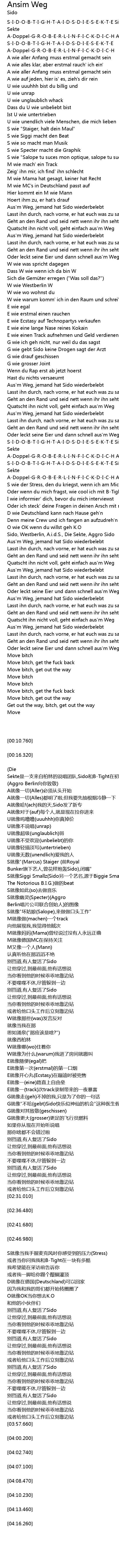 | [00:56.150] | S就像Siggi Smallz(Sido另一个艺名,源于Biggie Smalls a.k.a. The Notorious B.I.G.)做的beat |