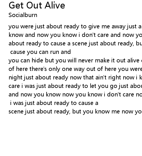 you were just about ready to give me away just about ready to sell me out now i know and now you know i don't care and now you know i don't care i was just about ready to cause a scene just about ready, but you know me now you know, now you know i don't care now you know, i don't care [chorus] cause you can run and you can hide but you will never make it out alive cause there's only one way out of here there's only one way out of here you were just about ready to call it a night just about ready now that ain't right now i know and now you know i don't care i was just about ready to let you go just about ready to steal this show and now you know now you know i don't care now you know i don't care [chorus 2x] there's only one way out of here [repeat] i was just about ready to cause a scene just about ready, but you know me now you know, now you know i don't care |