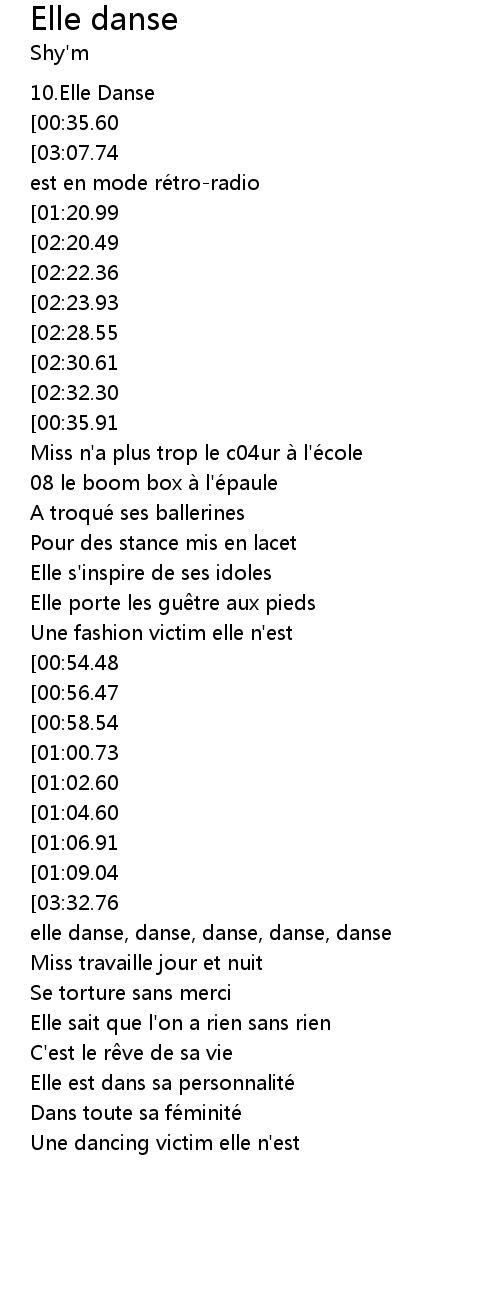| [03:36.32][03:32.76][03:28.63][03:24.44][02:46.74][02:42.55][02:38.30][02:34.42][01:39.93][01:35.80][01:31.74][01:27.67] | Et elle danse, danse, danse, danse, danse |