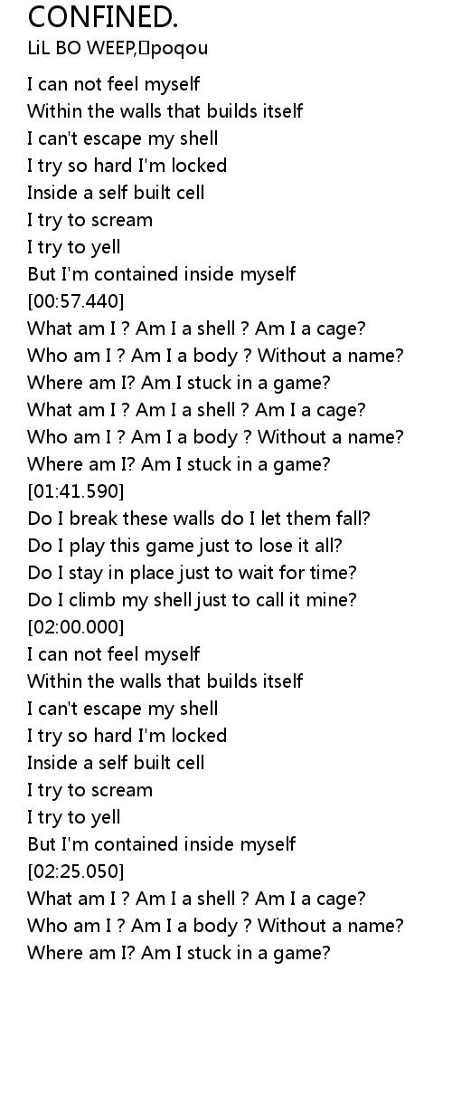 | [02:26.150] | What am I ? Am I a shell ? Am I a cage? |