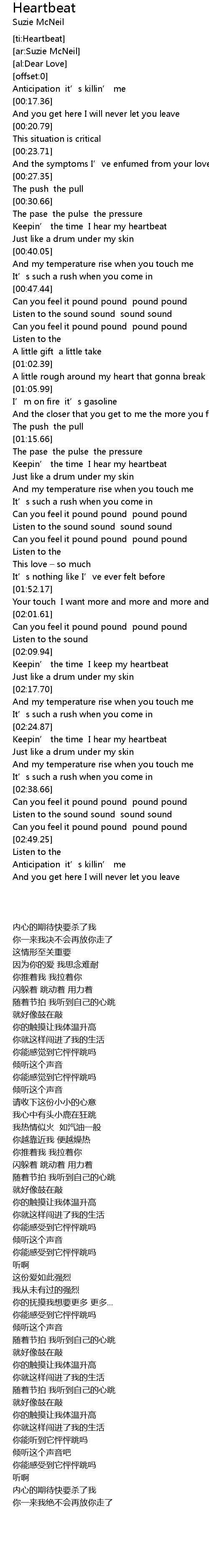 | [00:34.71] | Keepin’ the time I hear my heartbeat |