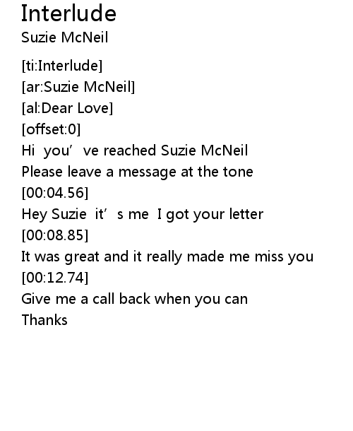 | [00:01.34] | Hi you' ve reached Suzie McNeil |