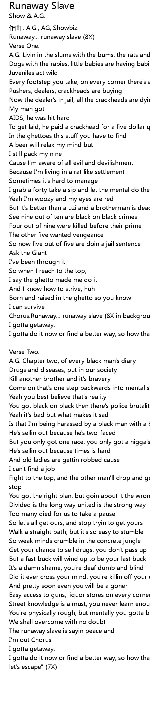 | Chorus:Runaway... runaway slave (8X in background) | |