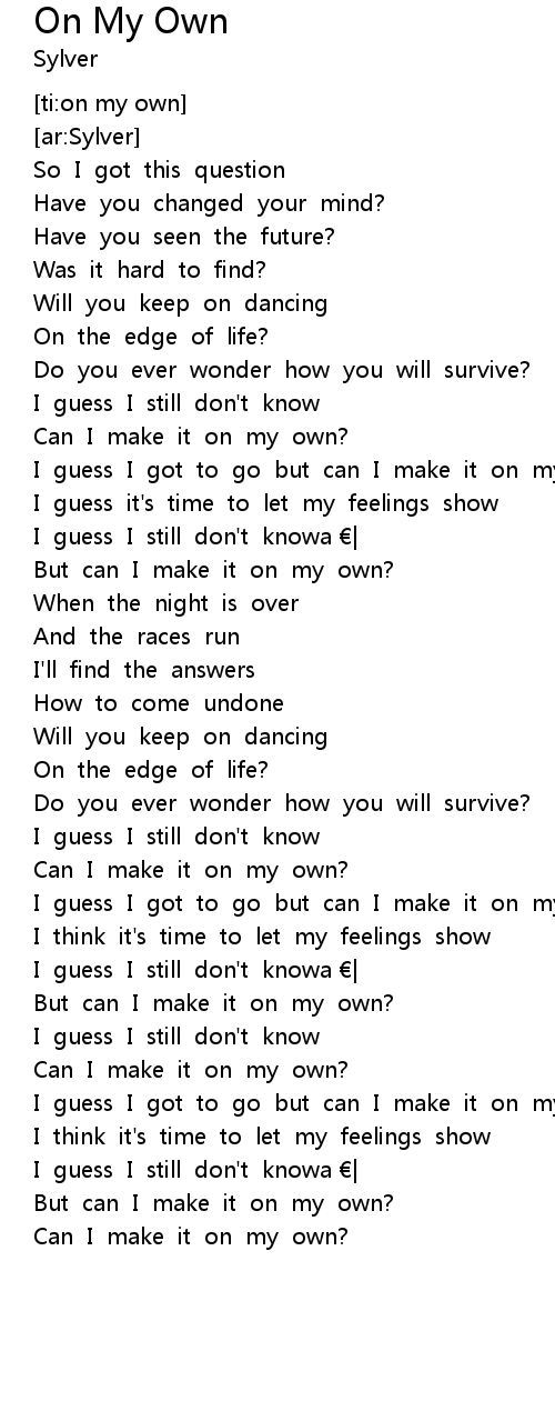 | [01:17.26] | I guess I got to go but can I make it on my own? |