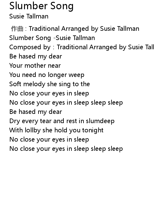 | [00:00.371] | Slumber Song -Susie Tallman |