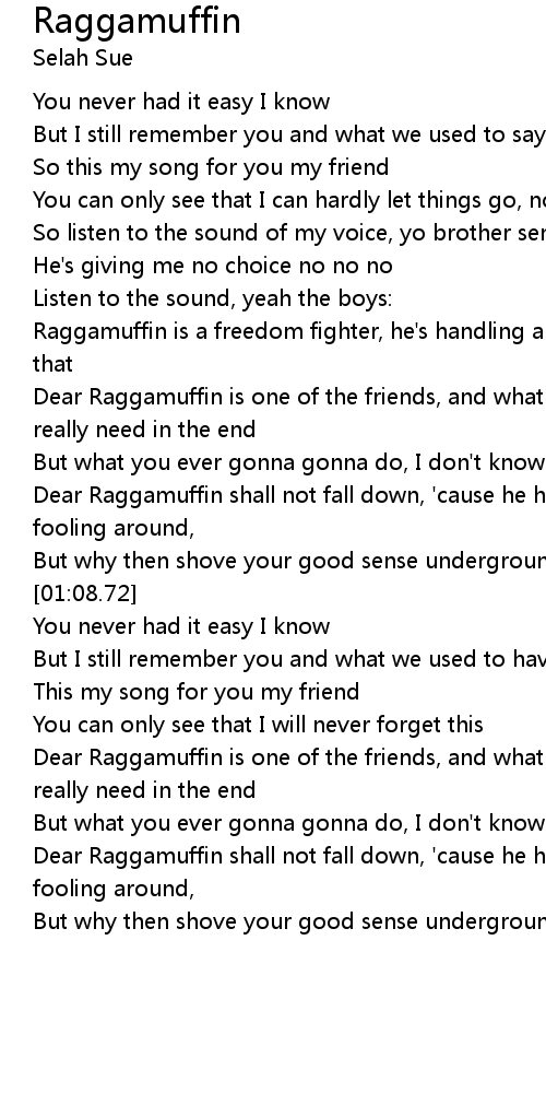 | [00:59.91] | Dear Raggamuffin shall not fall down, 'cause he has the wisdom of not fooling around, |