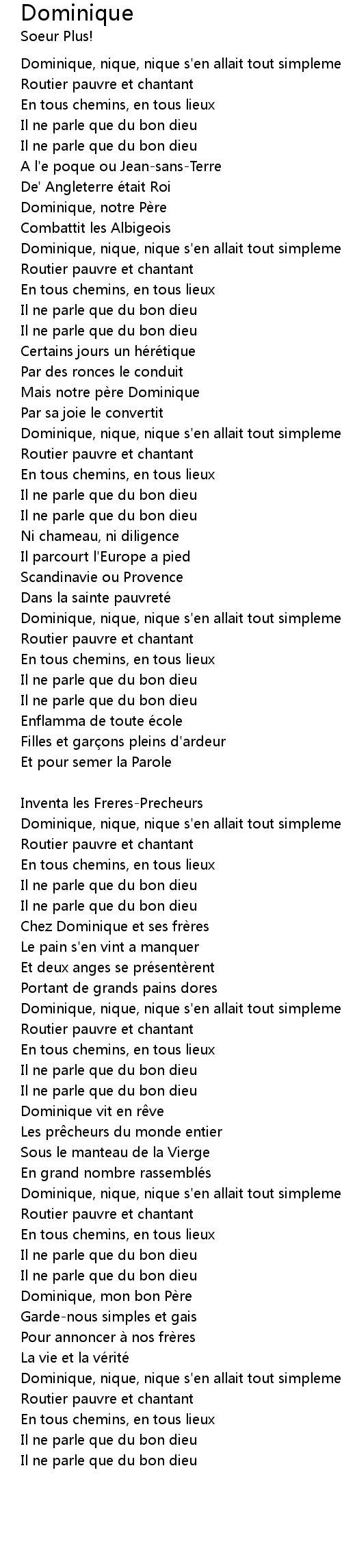 | Dominique, nique, nique s' en allait tout simplement | |