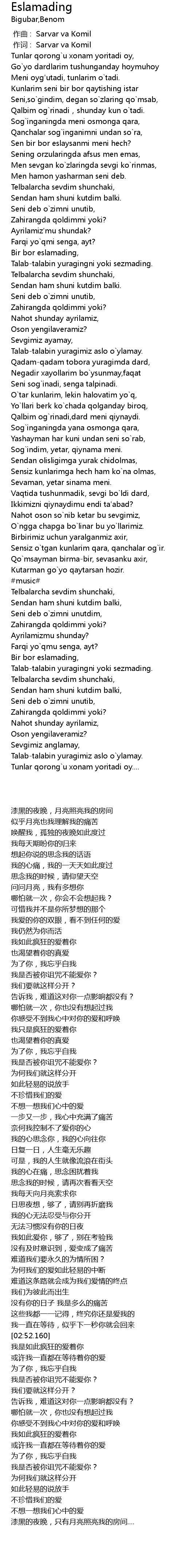 | [00:37.185] | Sen bir bor eslaysanmi meni hech? |