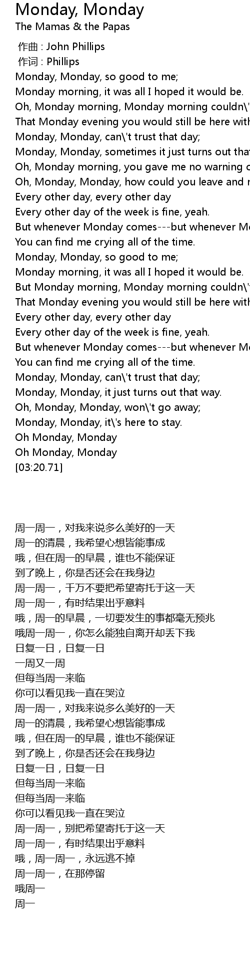 | [03:17.00] | Oh Monday, Monday |