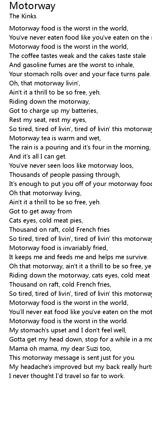Oh that motorway, ain't it a thrill to be so free, yeh, |
