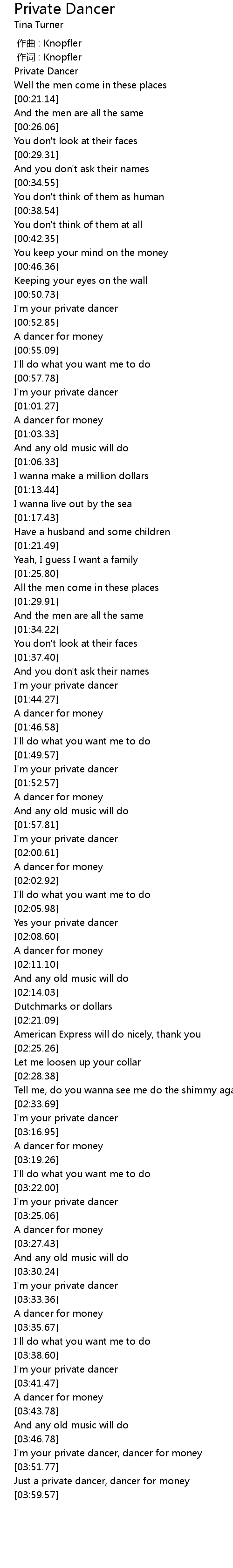 | [03:52.77] | Just a private dancer, dancer for money |
