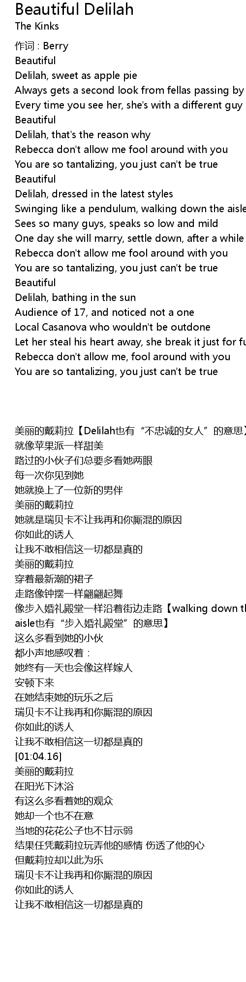 | [00:04.82] | 美丽的戴莉拉【Delilah也有“不忠诚的女人”的意思】 |