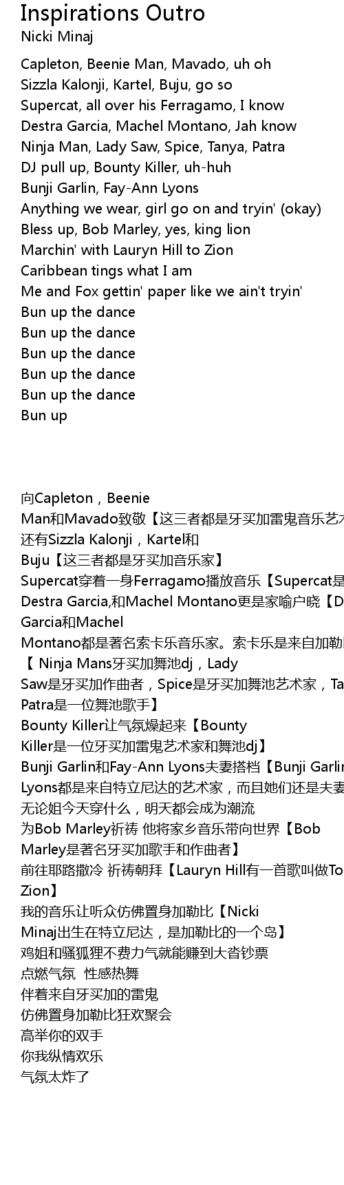 | [00:26.20] | 我的音乐让听众仿佛置身加勒比【Nicki Minaj出生在特立尼达,是加勒比的一个岛】 |