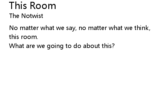 No matter what we say, no matter what we think, we will never, will never leave this room.