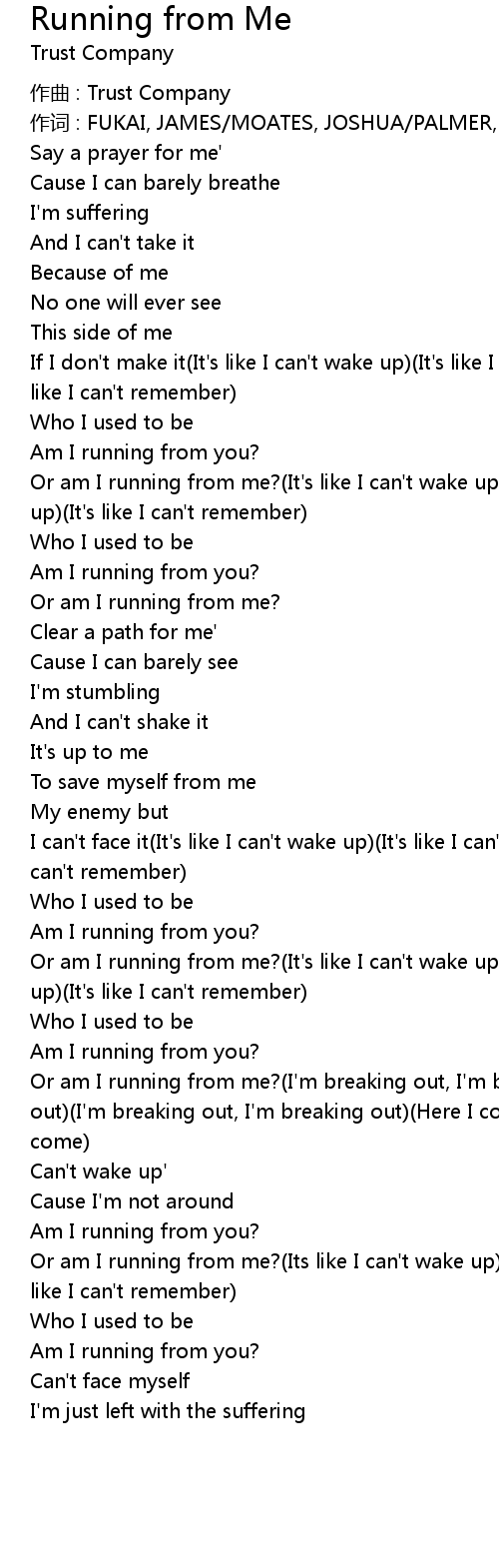 | Or am I running from me? It' s like I can' t wake up It' s like I can' t get up It' s like I can' t remember | |