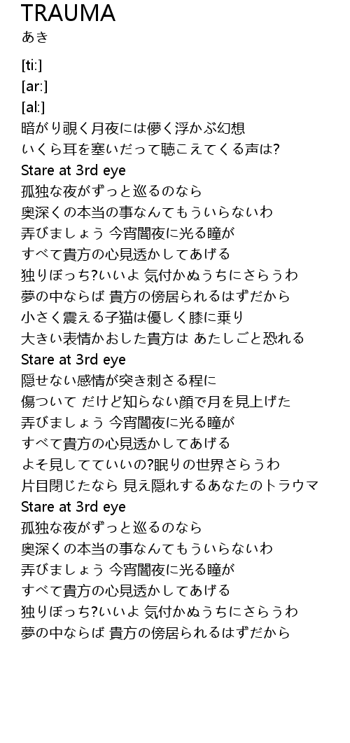 | [02:18.29] | 片目閉じたなら 見え隠れするあなたのトラウマ |