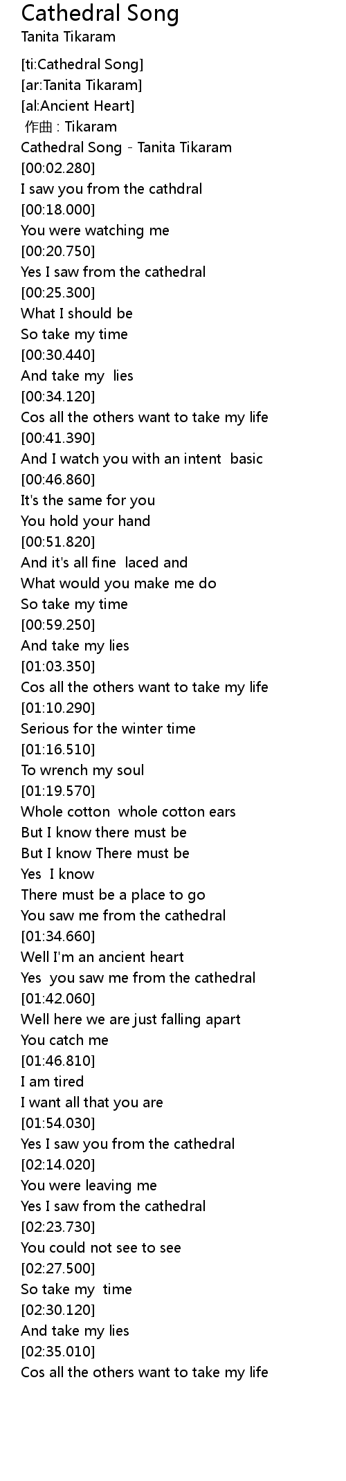 | [00:00.900] | Cathedral Song Tanita Tikaram |