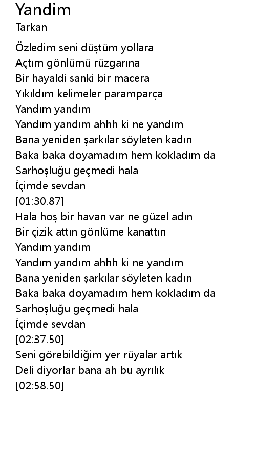 | [00:57.54] | Yandım yandım ahhh ki ne yandım |