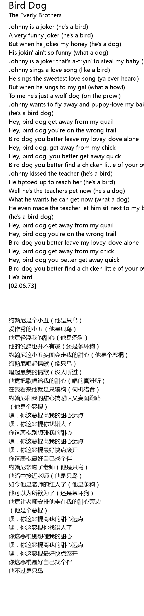 | [00:53.39] | Bird dog you better leave my lovey-dove alone |