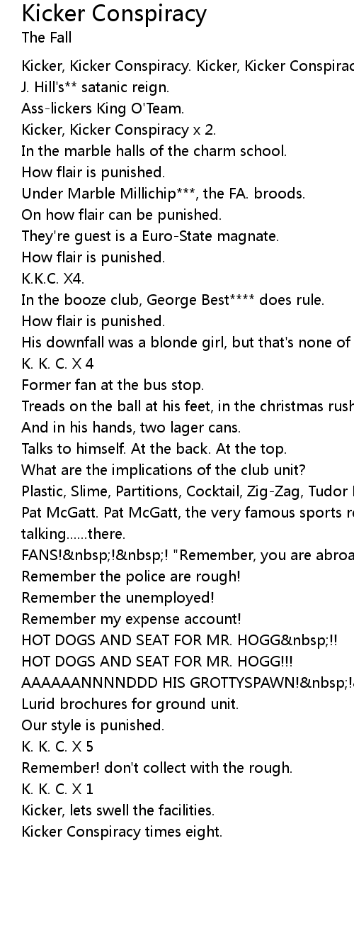 Kicker, Kicker Conspiracy. Kicker, Kicker Conspiracy. |