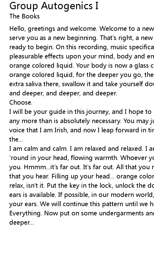 Hello, greetings and welcome. Welcome to a new beginning, for this tape will serve you as a new beginning. That's right, a new beginning, as we're about ready to begin. On this recording, music specifically created for its pleasurable effects upon your mind, body and emotions is mixed with a warm orange colored liquid. Your body is now a glass container. You can smell the orange colored liquid, for the deeper you go, the deeper you go. And if there's extra saliva there, swallow it and take yourself down deeper and deeper. Deeper and deeper, and deeper, and deeper. |