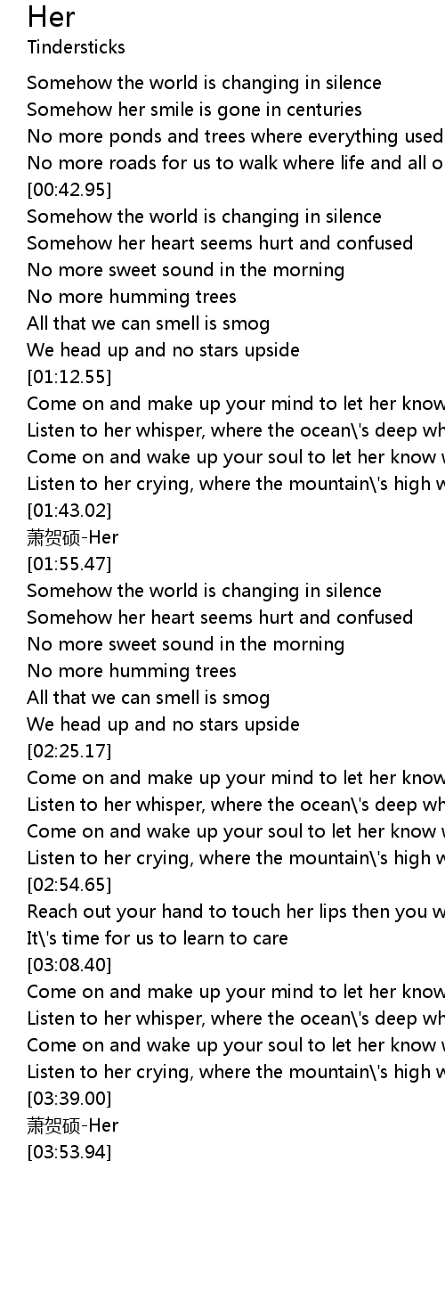 | [01:13.30] | Come on and make up your mind to let her know she\'s not alone |