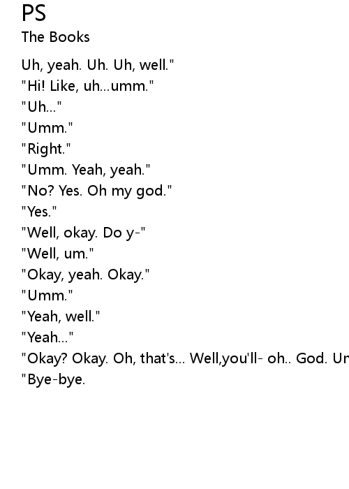 | "Okay? Okay. Oh, that's... Well,you'll- oh.. God. Umm, bye." | |
