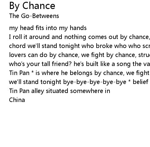 | I roll it around and nothing comes out by chance, we fight by chance, struck a chord we'll stand tonight who broke who who screamed who there's no two things lovers can do by chance, we fight by chance, struck a chord we'll stand tonight who's your tall friend? he's built like a song the valley of | |