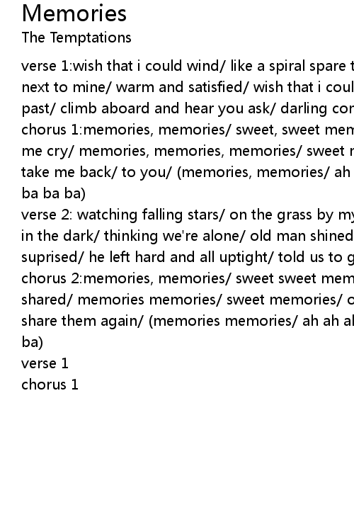 chorus 1:memories, memories/ sweet, sweet memories/ of days gone by/ that make me cry/ memories, memories, memories/ sweet memories/ that make me sad/ they take me back/ to you/ (memories, memories/ ah ah ah ah ah ah ah/ ba ba ba ba ba ba ba ba) |