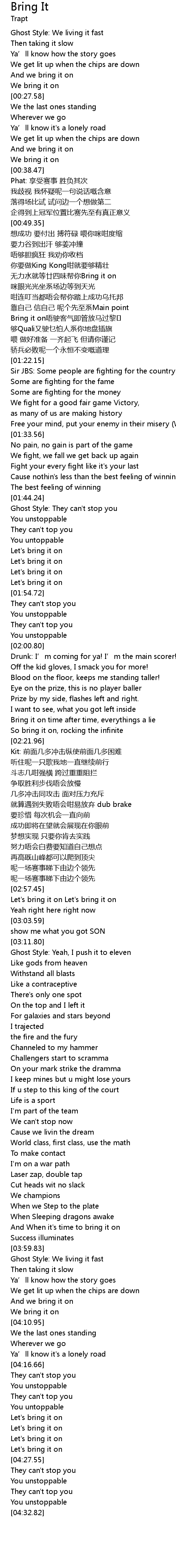 | [01:11.63] | Bring it on唔驶客气即管放马过黎 |