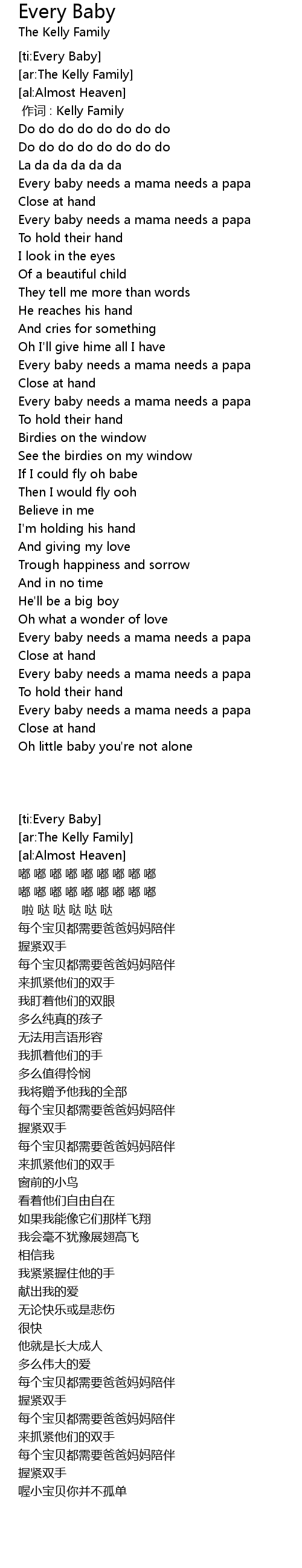 | [00:39.20] | Every baby needs a mama needs a papa |