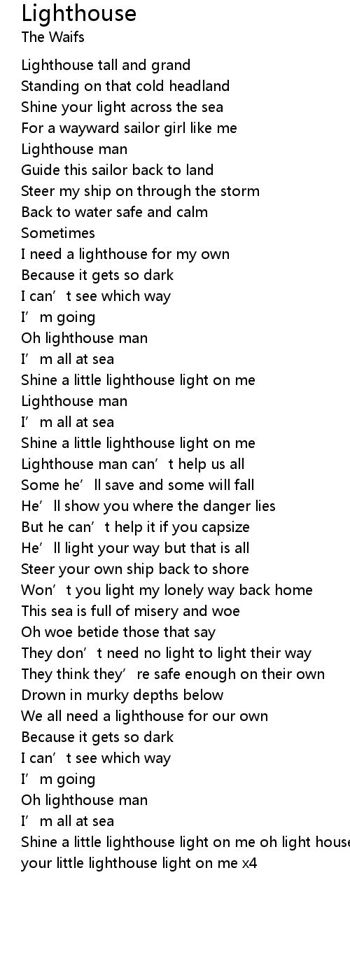 | Shine a little lighthouse light on me oh light house man im all at sea shine your little lighthouse light on me x4 |