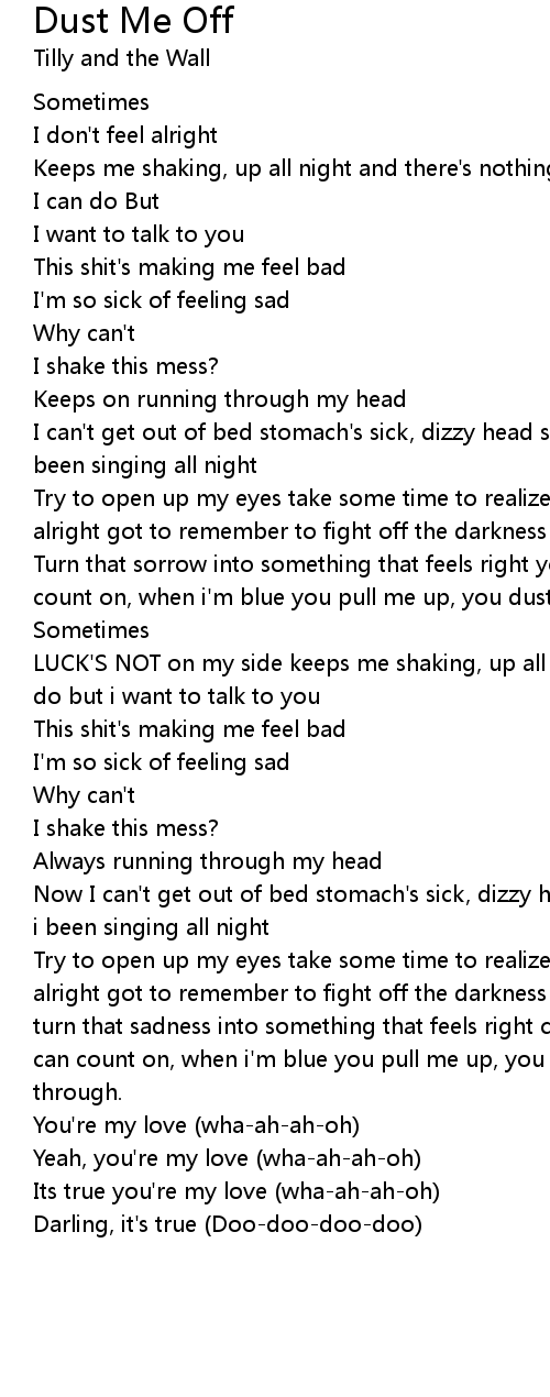 Try to open up my eyes take some time to realize sometimes shit won't feel alright got to remember to fight off the darkness that creeps in, sometimes. and turn that sadness into something that feels right cause you're a true friend i can count on, when i'm blue you pull me up, you dust me off, you pull me through. |