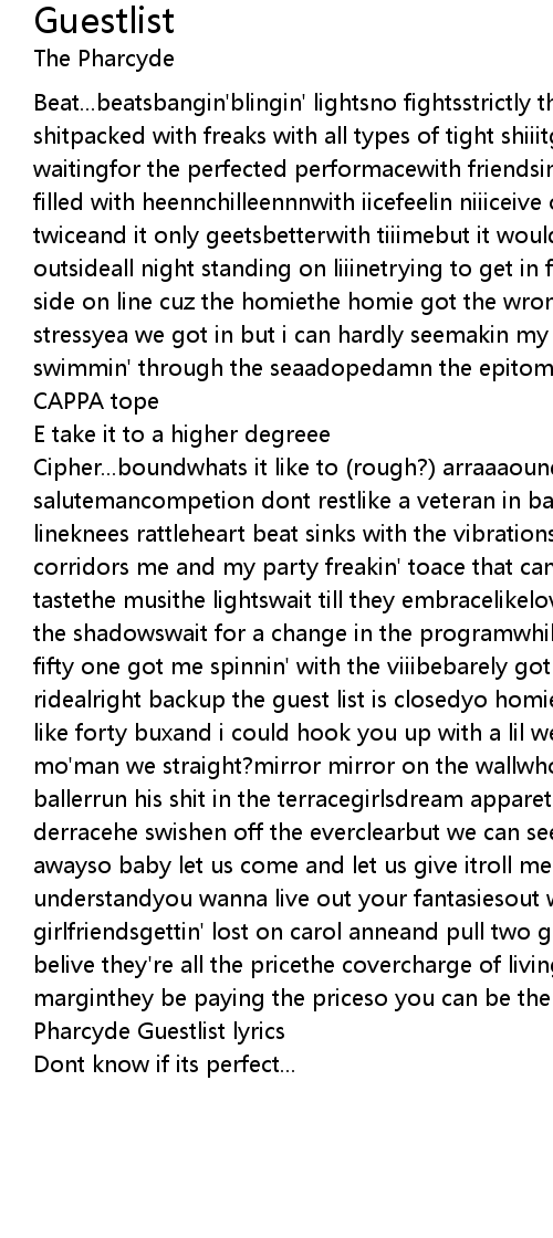 Beat...beatsbangin'blingin' lightsno fightsstrictly the viiibethe hyphe shitpacked with freaks with all types of tight shiiitglam or ousno rushpatienty waitingfor the perfected performacewith friendsim rolling bluntsholding cups filled with heennchilleennnwith iicefeelin niiiceive only beeento this spot twiceand it only geetsbetterwith tiiimebut it woulda been 100% betterif i wasnt outsideall night standing on liiinetrying to get in fo free or lessunlessout side on line cuz the homiethe homie got the wrong code addressadd it to the stressyea we got in but i can hardly seemakin my way through the peopleslike swimmin' through the seaadopedamn the epitomyyy