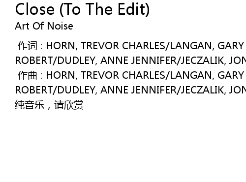 | [00:01.000] | 作曲 : HORN, TREVOR CHARLES/LANGAN, GARY MICHAEL/MORLEY, PAUL ROBERT/DUDLEY, ANNE JENNIFER/JECZALIK, JONATHAN EDWARD STEPHEN |