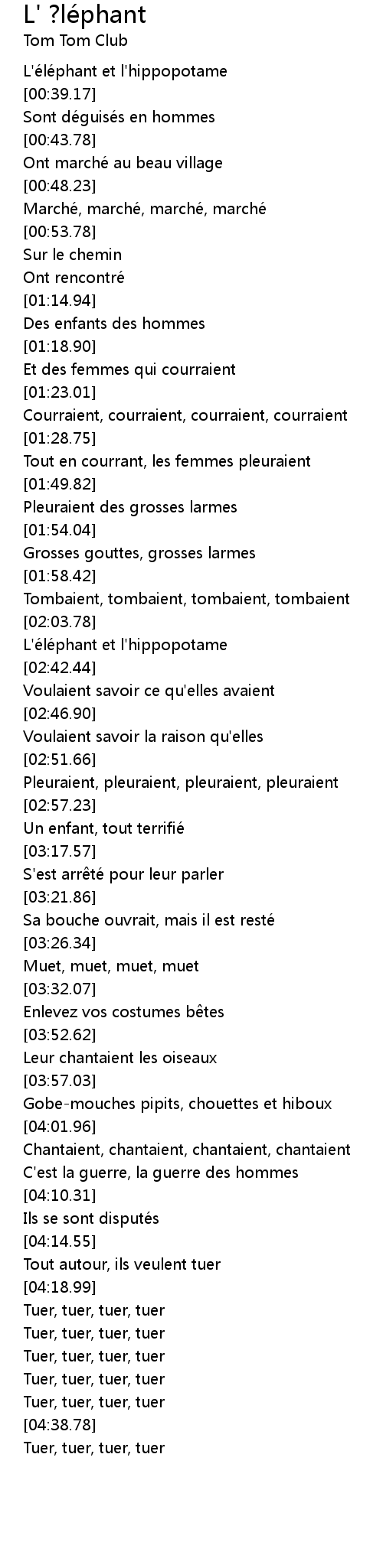 | [02:39.32] | L'é lé phant et l' hippopotame |