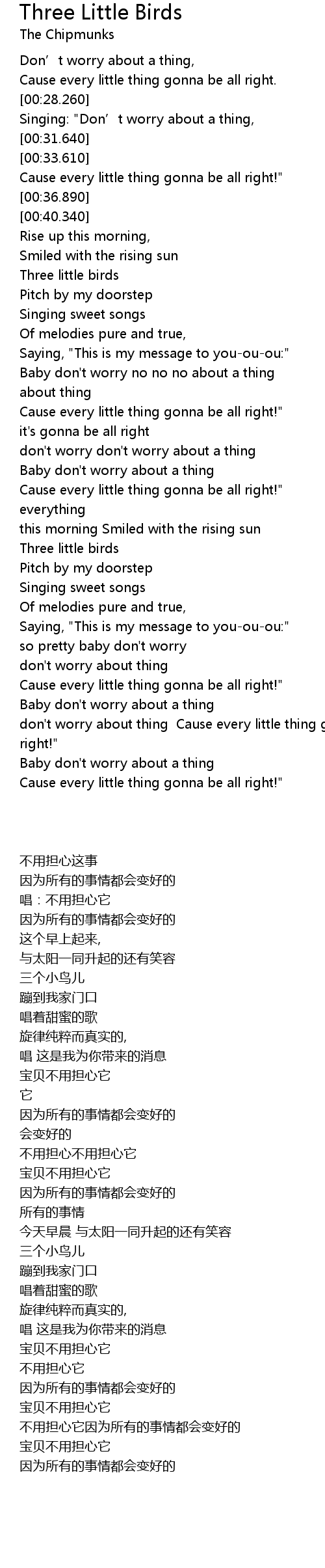 | [00:31.000] | Singing: " Don' t worry about a thing, |