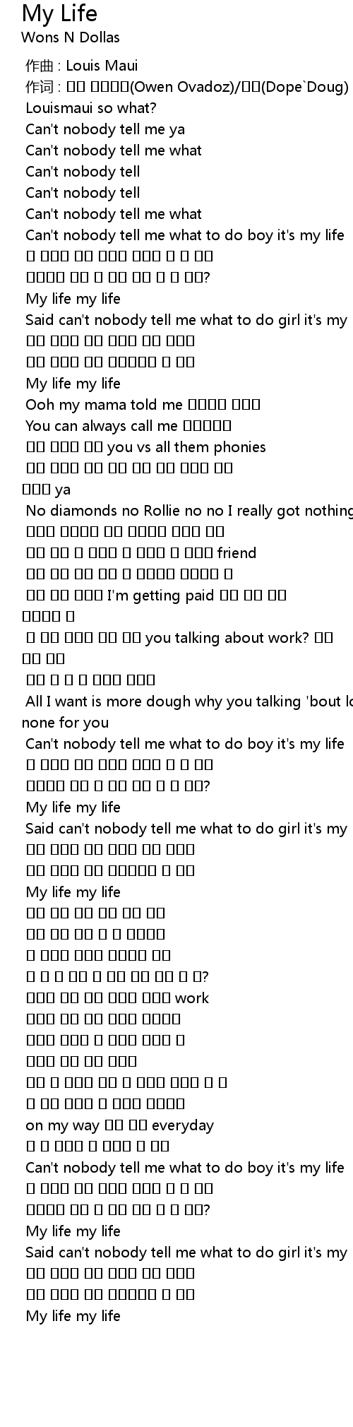 | [01:50.109] | Can' t nobody tell me what to do boy it' s my life |