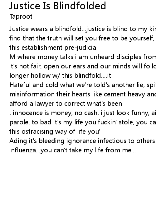Justice wears a blindfold...justice is blind to my kind w/ an open mind you will find that the truth will set you free to be yourself, equality is unheard of, in this establishment pre-judicial |