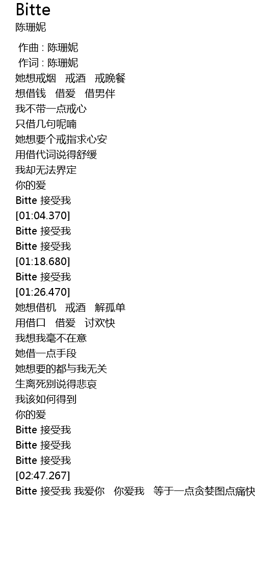 | [02:33.257] | Bitte jiē shòu wǒ |