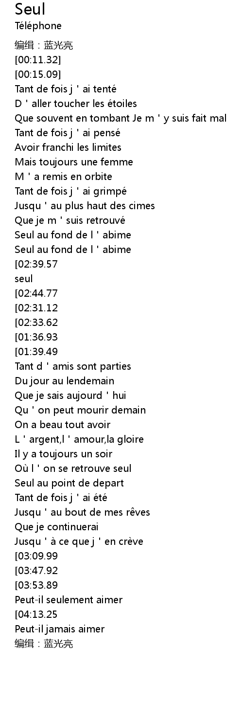 | [03:15.77][02:39.57][02:20.75][01:27.35][01:08.22] | Celui qui n a jamais e te seul |