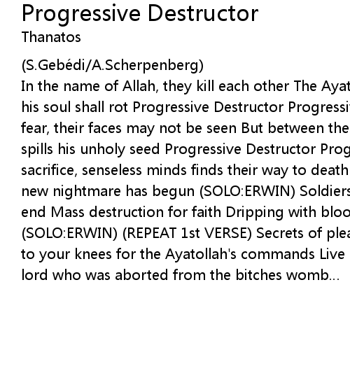 | In the name of Allah, they kill each other The Ayatollah is their god, in Hell his soul shall rot Progressive Destructor Progressive Destructor Women living in fear, their faces may not be seen But between their legs he is pleased, and spills his unholy seed Progressive Destructor Progressive Destructor Unholy sacrifice, senseless minds finds their way to death A new Führer has risen, a new nightmare has begun (SOLO:ERWIN) Soldiers of Allah, blind obedience till the end Mass destruction for faith Dripping with blood, burning in flames (SOLO:ERWIN) (REPEAT 1st VERSE) Secrets of pleasure locked up in the book Fall to your knees for the Ayatollah's commands Live by the lies of your lord Your lord who was aborted from the bitches womb… |