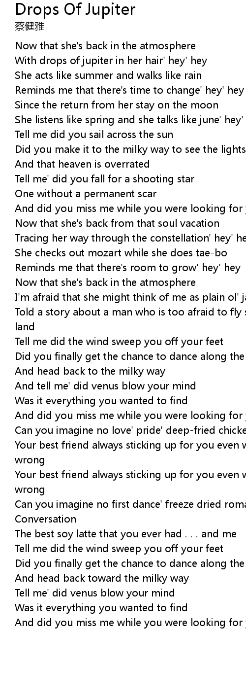 | [00:08.158] | With drops of jupiter in her hair' hey' hey |