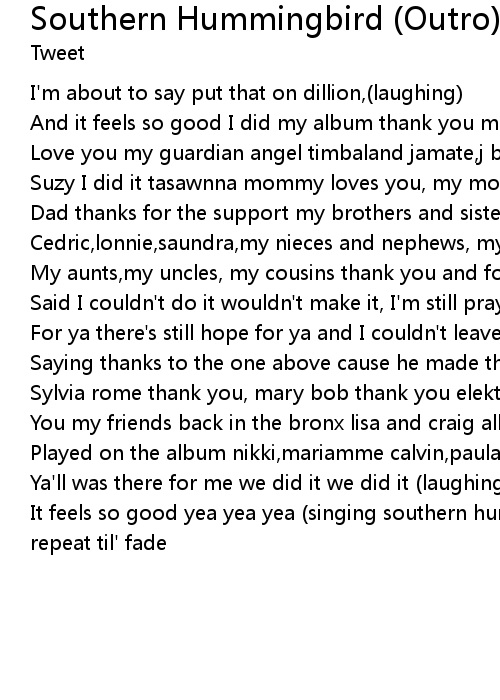 It feels so good yea yea yea (singing southern hummingbird) |